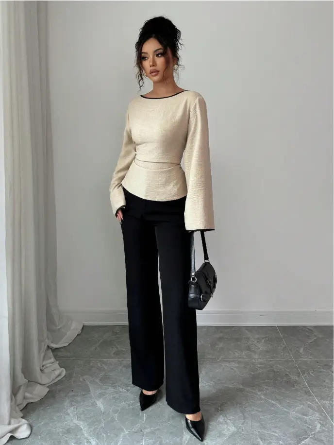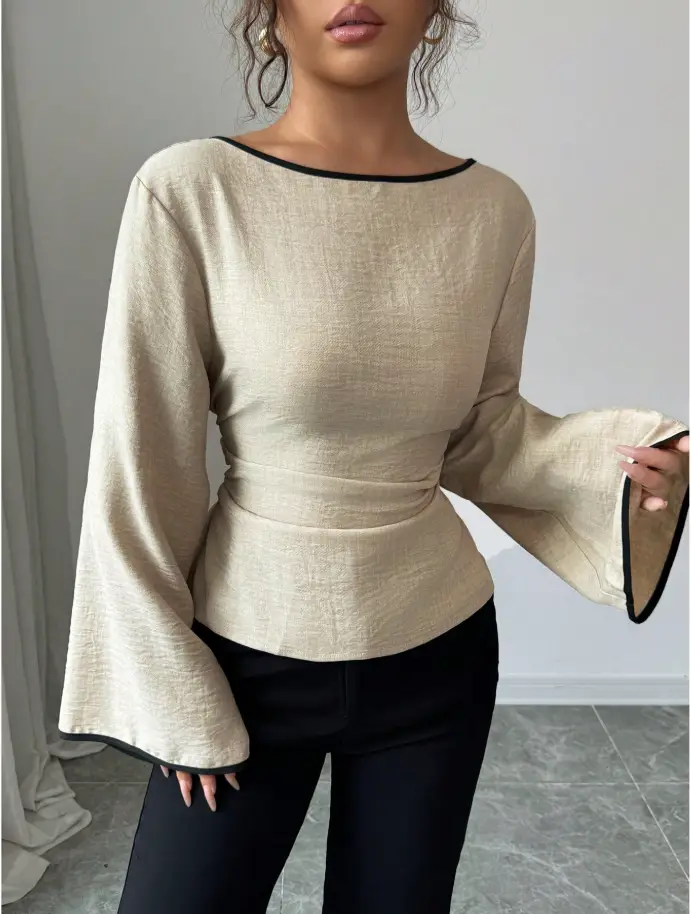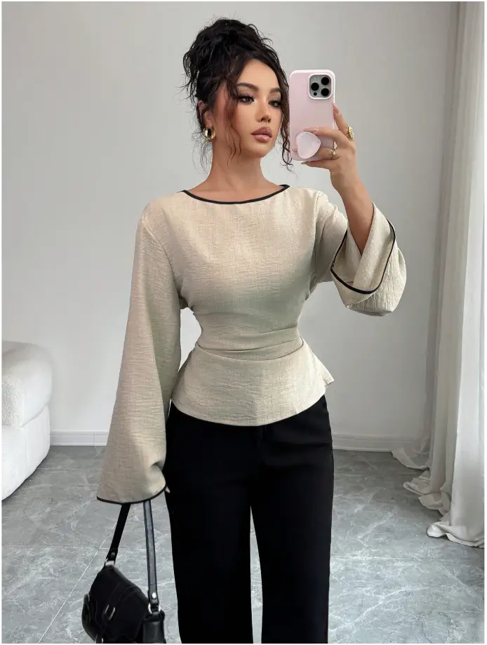 Siren Gaze Women’s Round Neck Ruffle Cuff Flare Sleeve Pleated Fashion Blouse Winter Casual Spring